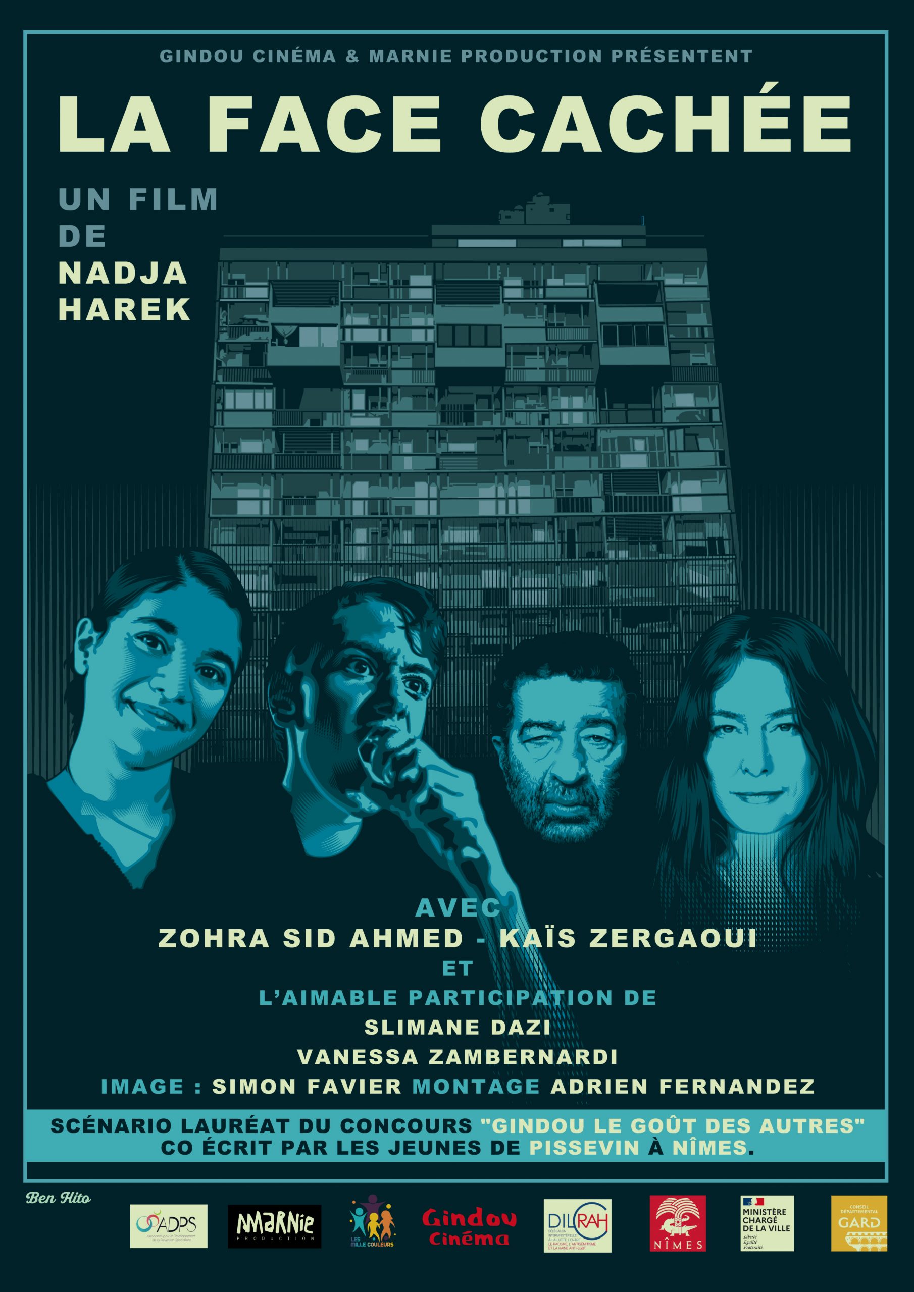 Lauréat du concours « Le Goût des Autres », La Face Cachée a été co-écrit, co-réalisé et joué par des jeunes du quartier Pissevin, accompagnés par Nadja Harek, la réalisatrice, qui a su guider les jeunes tout en leur offrant une place centrale dans la création du film. Gindou Cinéma et Marnie Production ont assuré la production et l’accompagnement technique, garantissant une réalisation de qualité. Enfin, l’ADPS, Mille Couleurs et Stand’Hop ont facilité l’implication des jeunes et soutenu cette belle aventure.
