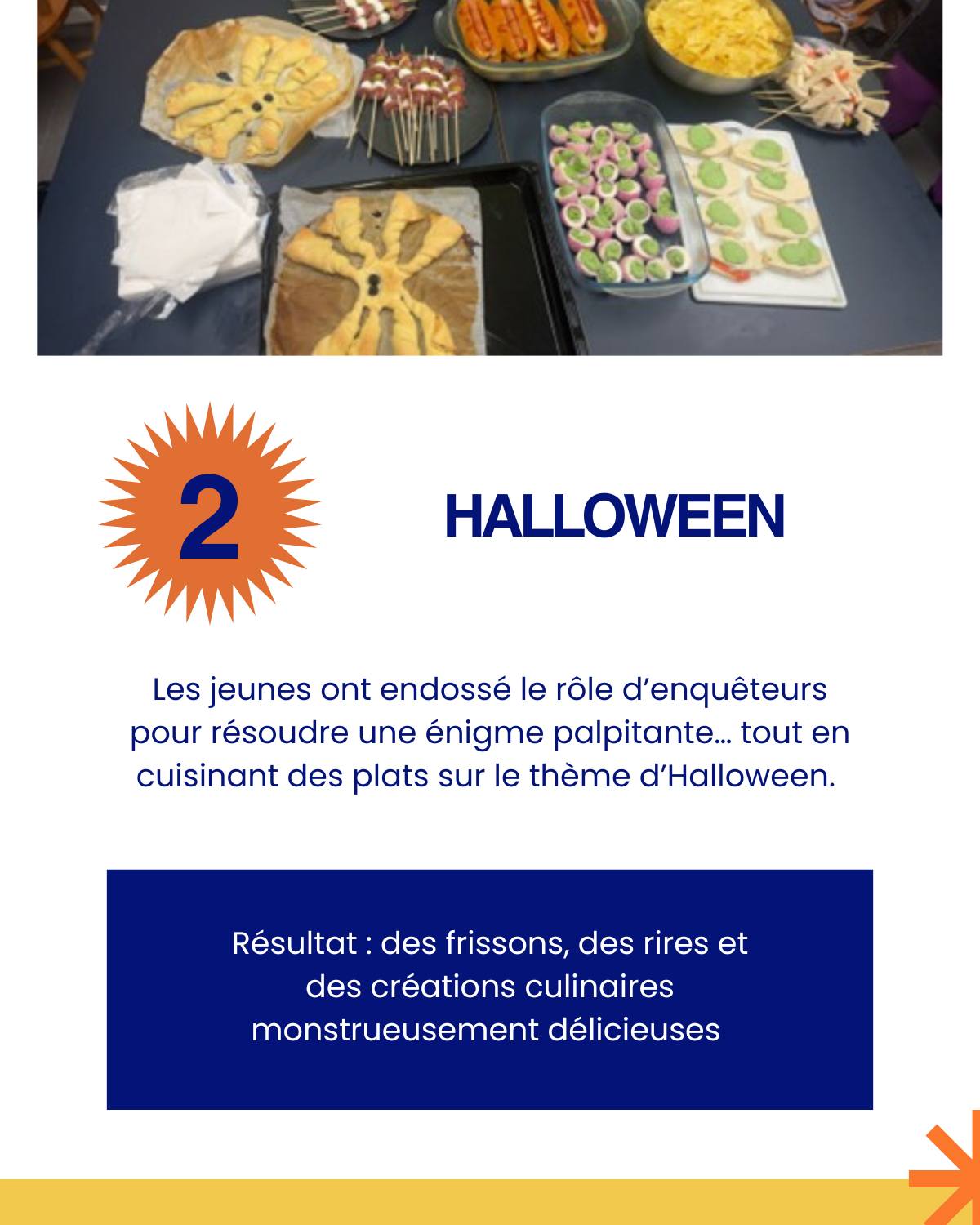 Une enquête grandeur nature mêlée à un atelier cuisine sur le thème d’Halloween. Objectif : développer l’esprit d’équipe, la logique et la créativité… tout en s’amusant !
